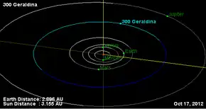 Geraldina (minor planet designation: 300 Geraldina) is a large Main belt asteroid.[1] It was discovered by Auguste Charlois on October 3, 1890, in Nice. The origin of the name is unknown.[2] It is orbiting the Sun at a distance of 3.21 AU with a period of 5.74 yr and an eccentricity (ovalness) of 0.057. The orbital plane is tilted at an angle of 0.73° to the plane of the ecliptic.[1]