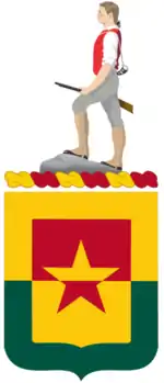 The 313th's coat of arms was approved on 12 October 1925 and its distinctive unit insignia was approved on 5 August 1927. Both were rescinded on 2 February 1959. The distinctive unit insignia included a 1 1/8 in (2.86 cm) gold colored metal and enamel device, which consisted of shield with a half yellow, half green border. The center of the shield included a counterchanged red and yellow star. The colors of the shield symbolized the regiment's service as cavalry, artillery, and then cavalry. The star represented Texas, where it was organized, and the green and yellow border represented its service on the southwestern border. The regimental motto, "We Also Serve", was attached to the bottom of the distinctive unit insignia. The regimental coat of arms was of a similar design to the distinctive unit insignia but included the Organized Reserve's Minuteman crest above the shield and omitted the motto.[6]
