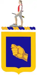 The regimental coat of arms and distinctive unit insignia were approved on 16 April 1929, and both were rescinded on 26 February 1959. The distinctive unit insignia consisted of a gold colored metal and enamel device 1 1/16 (2.70 cm) in height with a blue shield and a yellow border. A gold clenched hand with forefinger wrapped over the thumb was in the center of the shield. The regimental motto, "Mah be-ah" (Shoshone for We Defy) was attached to a scroll at the top of the insignia. The yellow represented the cavalry and the hand represented defiance in Indian Sign Language. The motto was in Shoshone due to the historical presence of Shoshone in the area where the regiment was organized. The coat of arms was of a similar design except that it omitted the motto and included the Organized Reserve Minuteman crest above the shield.[4]