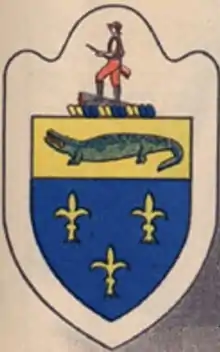The 328th Infantry Regiment’s Distinctive Unit Insignia was designed after its recall to active duty for World War II.[1] The Minuteman at its top recalls the regiment's status as a Reserve unit and symbolizes its readiness to be called up at a moment’s notice.[1] The alligator recalls the 328th Infantry’s years between the world wars when the regiment's headquarters and subordinate companies were located in Florida.[1] The three fleur-de-lis are symbols of the regiment’s most important World War I engagements in France -- its initial battles in Lorraine and the St. Mihiel and Meuse-Argonne offensives.[1]