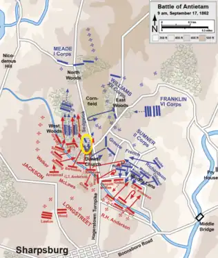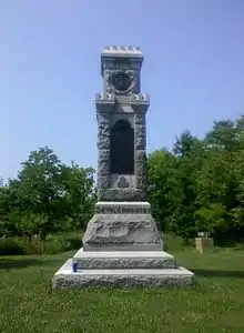 At 7:30 on the morning of September 17, 1862, the Thirty-fourth Regiment left camp near Keedysville, crossed the Antietam Creek and marched westward into the East Woods, now extinct. Facing Westward being on the extreme left of Brigade line it emerged from the East Woods and soon became heavily engaged with the Confederate forces in its front. Crossing the open field and the Hagerstown Pike, it entered the West Woods, now also extinct, the line extending North and South of the Dunkard Church. The left of the Regiment being unprotected was in danger of being enveloped by the enemy, and a hasty retreat became necessary; the Regiment reforming near the East Woods with its organization intact. In a very brief time 43 men had been killed and 74 wounded, the killed being 13 percent of all engaged.[3]