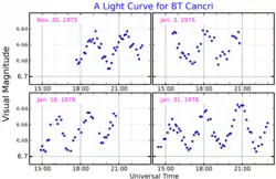 A visual band light curve for BT Cancri, plotted from data published by Gupta (1979)[1]