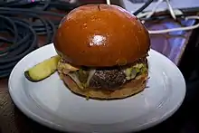 The 50/50 Burger patty is a half ground bacon, half ground beef burger patty developed by Scott Slater for Slater's 50/50 restaurant.[1][2] The 50/50 Burger consists of a 50% ground bacon and 50% ground beef patty topped with a sunny side up egg, avocado mash, pepper jack cheese and chipotle adobo mayo on a hamburger bun.[3]