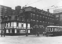 Streetcar service on Spadina Avenue began in 1878 as a horsecar line operated by the Toronto Street Railway. In 1891, the Toronto Railway Company created a route called the Belt Line that ran as a loop along Spadina Avenue, Bloor Street, Sherbourne Street, and King Street.[3] In 1923, the Toronto Transportation Commission reconfigured the streetcar network, discontinuing the Belt Line and creating Spadina as a separate streetcar route. The Spadina route operated until 1948, when it was replaced by buses.[4] The tracks on Spadina between Dundas Street and Harbord Street were used by the Harbord streetcar route until its discontinuation in 1966,[4] after which, only the tracks between King and College streets were retained for diversions along Spadina Avenue.[5]
