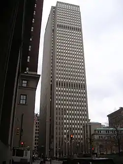 525 William Penn Place was one of the first skyscrapers built in Pittsburgh as part of longtime Mayor David Lawrence's Renaissance I building initiative to rebuild downtown Pittsburgh. The building was built by the then Pittsburgh Pirates owner John W. Galbreath with loans from the Mellon National Bank and additional financing from insurance companies.[2] At the time of construction, Mellon purchased floors 2-8 by deed in 1951 from John W. Galbreath. The building was designed by Harrison & Abramovitz with construction by the Turner Construction Company.[3] It was built on the site of the Henry Hotel which was demolished to prepare the site for the tower in 1949.[4]