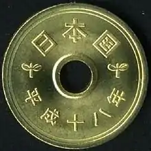 Almost 20 years would pass before the Japanese government authorized the production of a new five yen coin. These new coins were first struck in 1948 and are made of a brass alloy consisting of 60 to 70% copper, and 30 to 40% zinc.[15][16] Using this type of alloy combination is now a remnant from when World War II era weapons were scrapped to produce the coins.[17] These coins feature a pigeon within a circle on one side and the National Diet on the other and were only minted for two years. Two different varieties were made in 1949 which included the old pigeon type coins, and new coins featuring a hole in the center. These first holed five yen coins use an old style Japanese script known as Kaisho.[15] The Japanese government added the hole in the center of the coin to save material costs.[18] The overall design of the coin featuring rice, water and a gear on the obverse, and tree sprouts on the reverse has not changed since this time. The final design which is minted today uses a modern style script which was first added in 1959.[15]