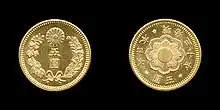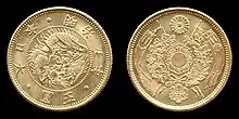 Five yen coins were first struck in gold for the Japanese government in 1870 at the San Francisco Mint.[1] During this time a new mint was being established at Osaka, which did not receive the gold bullion needed for coinage until the following year.[2] The yen as a unit of currency was officially adopted by the Meiji government in an act signed on June 27, 1871.[3] For this particular denomination, its not known if any five yen coins dated 1871 (year 4) were actually struck that year as official records have coinage beginning in 1872.[4][5] The first and second five yen coin designs feature a dragon figure on the obverse surrounded by legends, while the reverse features the emblem of the Imperial family.[lower-alpha 1] Each coin was initially struck in .900 fine gold with a weight of 8.3g, and a diameter of 23.8mm.[6] The diameter was later reduced to 21.8mm when the second design was introduced in 1872.[7] Five yen coins continued to be struck uninterrupted until 1879, when for an unknown reason none were recorded as minted. Coinage resumed in 1880 and remained unchanged until 1897 when Japan officially switched from a silver standard to a gold standard.[8] During this time the gold five yen coin was given a third and final new design. The diameter was reduced from 21.8mm down to 16.9mm, and the weight was changed from 8.3 to 4.2 grams. Redemption of old silver coins for new gold coins at par began on October 1, 1897 and lasted until closure on July 31, 1898.[9][10]