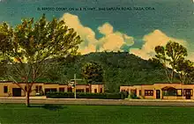 It was built by Isaac Burnaman.[3] It consisted of 17 concrete block and stucco cottages, each with attached garages, providing privacy as guests could enter through the garage.[3] A postcard advertising El Reposo Court, with mention it was owned and operated by Mrs. Nora Wilson, indicates it was on 66–75 Highway, i.e. that Route 66 and US 75 were the same there.[3]