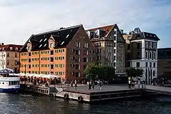 The building is built in red brick and has 14 bays along Nyhavn and 4 bays along the main harbour front