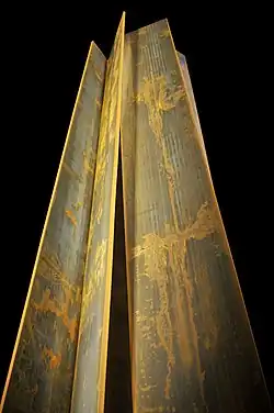 The original concept for the sculpture was an eight-sided, 66-foot (20-meter) tall model. This was amended later following discussions with Sheikha Al Mayassa, who was not convinced with the model.[3] Finally, the revised plan involved seven plates of German-made Cor-ten steel assembled in a heptagonal shape and stretching 80 feet (24 meters) in the air. The design was heavily influenced by the minarets found throughout the Muslim world.[5] A distinctive architectural feature of mosques, these tall spires date back to the seventh century. It is particularly the Ghazni minaret in Afghanistan that was the key inspiration for Serra. Richard Serra also found inspiration in the Quran's repeated use of the number seven and the fact that Persian mathematician and astronomer Abu Sahl al-Quhi was the first person to build a seven-sided heptagonal shape.[4] These three elements would ultimately define and focus the project. Measuring ten feet wide at the base and narrowing to nine feet at the top, the tower's walls are placed so as to include three triangular openings, allowing interplay between the work and the viewer, and between the space of the outside world and the space of the work of art.[6] The sculpture's steel slabs are made from Shanxi Black Granite and are designed to be naturally bronzed by the elements. Over an eight-year period the colour is expected to change from orange to a uniform dark shade via a process of oxidation. Each of the seven steel plates is eight feet wide (2.4 metres) and four inches thick.[7] Visitors are able to walk inside the structure and look up at the sky above.