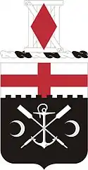 Black and white were the old colors of the Engineer Corps. The anchor and oars device was the badge of the Engineers and Pontoniers of the Army of the Potomac where the old units of the regiment did such gallant service. The crescents are the device of General Winfield Scott and represent the service of the old company in 1846–1848 in the Mexican War. In France, the regiment served with great gallantry in the 5th Division. The crossing of the Meuse near Dun is indicated by the device in chief of the shield which is not only a cross for the crossing of the river but the device of the lords of Dun.