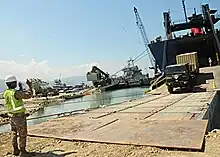 Service members from the U.S. Army 7th Sustainment Brigade off-load construction vehicles and equipment for Operation Unified Response in Port-au-Prince, Hait.