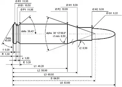Americans would define the shoulder angle at alpha/2 ≈ 19.1 degrees. The common rifling twist rate for this cartridge is 240 mm (1 in 9.45 in), 4 grooves, Ø lands = 7.89 mm, Ø grooves = 8.20 mm, land width = 4.40 mm and the primer type is large rifle.