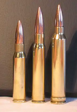 ![]() 8×60mm S cartridge between .308 Winchester (left) and .300 Win Mag (right) | ||||||||