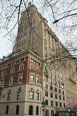 The 23-floor building was erected in 1926-1927 as a cooperative with 77 apartments, but today it has only 64 units.[4] Developer Joseph Paterno initially opted to list the building as an apartment-hotel so as to legally build 23 stories as opposed to only 15 stories restricted for apartment houses.[5] The building has a notable red-tiled steep-pitched roof, making it visible from a long distance. When it was built, The Real Estate Record & Guide praised the $1 million building's "unusually striking upper-floor effect."[6]