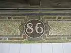 The walls along all four platforms are clad with white ceramic tiles. The ceramic tiles were installed during the early-2000s renovation and are raised about 1⁄4 inch (6.4 mm) from the original layer of tile. At the top of each wall is a colored mosaic frieze consisting mostly of yellows and browns.[6]: 4 Small "86" tablets in a circle run along this frieze.[6]: 4 [44] The name tablets have "86TH STREET" in a white serif font on a reddish-brown background with a buff-colored inner border and green outer border.[6]: 4 [45] Similar tile signs reading "DOWNTOWN TRAINS" and "UPTOWN TRAINS", accompanied by white arrows, are on the walls.[6]: 4 At the extreme southern ends of all four platforms, there are tan terracotta blocks and a darker trim line with "86TH ST" written on it in white sans serif font at regular intervals.[6]: 5