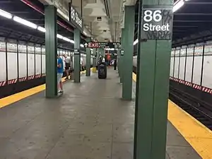 The platform and mezzanines above have dark green columns, and alternate columns have the standard black station name plate with white lettering reading "86 Street".[53][54] The track walls had their mosaic tiling restored as part of the station's 2011 renovation.[55][53] The southern section of the station is where the platform was extended in 1970, and they have no mosaic trims or tiles along the wall, instead including an extension of the tunnel benchwall.[24] The platform has several employee-facilities that have a mosaic trim line.[56]