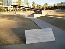 The 9/11 Memorial in Arizona is a state memorial to the events and aftermath of the September 11 attacks, located at the Wesley Bolin Memorial Plaza near the State Capitol in Phoenix, Arizona. The monument is a circular plan with a flat inclined metal ring. The ring was inscribed with written statements by cutting each letter through the metal, thus allowing sunlight to project the statements onto the concrete base of the monument.