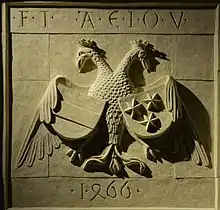 "A.E.I.O.U." (sometimes A.E.I.O.V.) was a symbolic device coined by Emperor Frederick III (1415–1493) and historically used as a motto by the Habsburgs. One note in his notebook (discovered in 1666), though not in the same hand, explains it in German and Latin as "All the world is subject to Austria" (Alles Erdreich ist Österreich untertan or Austriae est imperare orbi universo).[1] Frederick habitually signed buildings such as Santa Maria dell'Anima in Rome,[2] Burg Wiener Neustadt or Graz Cathedral as well as his tableware and other objects with the vowel graphemes.[3] A.E.I.O.U. is also the motto of the Theresian Military Academy, established in 1751.[4] It can also be found on the wall of the Chancellor's office in the Federal Chancellery of Austria. The famous device is probably the most known motto of premodern times, because it has repeatedly been given new interpretations. Unraveling the mystery of what the AEIOU means, is part of a centuries-long debate that is still ongoing today.[5]