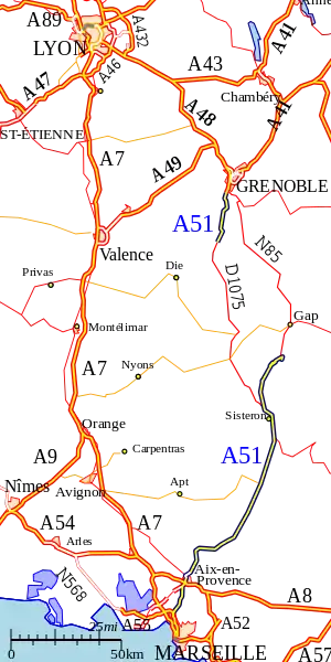 The A51 autoroute is a partly completed motorway in southeast France. It is the long-term project to connect Marseille to Grenoble via Aix-en-Provence, the Durance Valley and the Hautes-Alpes department.