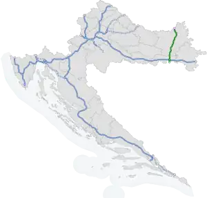 The A5 motorway (Croatian: Autocesta A5) is a motorway in Croatia spanning 83.6 kilometres (51.9 mi).[1][2] It connects Osijek, the largest city in Slavonia region, to the Croatian motorway network at the Sredanci interchange of the A3 motorway.[3] The A5 represents a significant northsouth transportation corridor in Croatia and is a part of the European route E73.[4] The A5 motorway route also follows Pan-European corridor Vc.[5] In addition to Osijek, the A5 motorway also passes near Đakovo and Beli Manastir.[6]