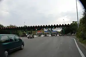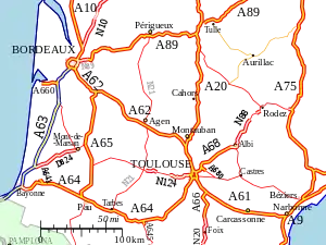 The A63 autoroute is a motorway in southwest France, connecting Bordeaux (from Junction 15 of the Rocade) to the border with Spain and Basque Country via the Autopista AP-8. The motorway, rather than being a purpose-built route, is an upgrade of the former RN10, which became a full toll road and no longer exists south of Bordeaux.[1] The motorway crosses Les Landes (moorland) as a dual-carriageway.