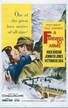 A Farewell to Arms is a 1957 American epic war drama film directed by Charles Vidor. The screenplay by Ben Hecht, based in part on a 1930 play by Laurence Stallings, was the second feature film adaptation of Ernest Hemingway's 1929 semi-autobiographical novel of the same name. It was the last film produced by David O. Selznick.