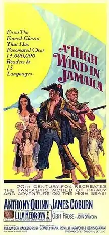 A High Wind in Jamaica is a 1965 DeLuxe Color adventure film, based on the 1929 novel of the same name by Richard Hughes, and directed by Alexander Mackendrick[2] for the 20th Century-Fox studio. It stars Anthony Quinn and James Coburn as the pirates who capture five children. Other cast members include Deborah Baxter, Nigel Davenport, Isabel Dean, Lila Kedrova, Kenneth J. Warren, and Gert Frobe. One of the child actors is the author Martin Amis.