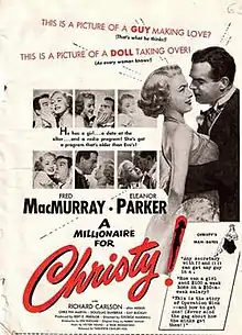 A Millionaire for Christy is a 1951 American comedy film directed by George Marshall and starring Fred MacMurray, Eleanor Parker and Richard Carlson. The film is a screwball comedy, in which Christy Sloane (Parker) is a legal secretary from San Francisco who is sent to Los Angeles to inform radio host Peter Lockwood (MacMurray) that he has just inherited $2 million.