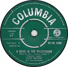"A Voice in the Wilderness" is a song by Cliff Richard and the Shadows, released as a single in January 1960. It peaked at number 2 on the UK Singles Chart and also received a silver disc for 250,000 sales.[2][3]