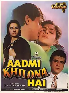 Aadmi Khilona Hai (transl. Man is a toy) is a 1993 Indian Hindi-language drama film, produced by Padma Rani under the FILMYUG Pvt. Ltd. banner and directed by J. Om Prakash. It stars Jeetendra, Govinda, Reena Roy, Meenakshi Sheshadri in the pivotal roles and music composed by Nadeem-Shravan.