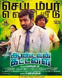 Following the release of Kaaka Muttai (2015), Manikandan revealed in July 2015 that he would direct Vijay Sethupathi in a film to be produced by G. N. Anbu Chazhiyan of Gopuram Films. Manikandan and Vijay Sethupathi had known each other before they entered the Tamil film industry and had regularly collaborated for independent short films.[3] The start of the shoot was delayed to allow Vijay Sethupathi to complete his ongoing projects, while Manikandan moved on to finish work on Kuttrame Thandanai (2016). Before the end of 2015, the makers announced that the film would be titled as Aandavan Kattalai and that composer K would work on the film's score and soundtrack. Manikandan stated it would be based in Chennai and would be a "realistic dark comedy" with a "quirky" subject.[4][5] Prior to release, it was revealed that the film would narrate the people's craze of trying to get settled in foreign country and taking bureaucratic shortcuts to achieve their goal.[6] Actress Ritika Singh was signed on to portray the leading female role of a journalist, only a month after the release of her first film Irudhi Suttru (2016).[7][8] An ensemble cast of actors including Pooja Devariya, Nassar, Singampuli and Yogi Babu also joined the team, before production began.[9] The film began production in early March 2016 at Kilpauk, Chennai and progressed swiftly throughout the city.[10] The final schedule was shot in a studio resembling an embassy in Chennai during May 2016.[11] Filming wrapped completed in July 2016.[12][13]