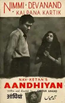 Aandhiyan (English: Cruel Winds) is a 1952 Hindi drama, written and directed by Chetan Anand. The story was written by Chetan Anand and Hameed Butt, based on an actual event in Amritsar. It stars Dev Anand, Kalpana Kartik, Nimmi in lead roles.[1] The music of the film was composed by the classical musician Ali Akbar Khan, with lyrics by Narendra Sharma.
