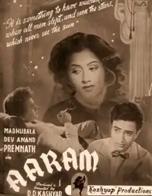 Aaram (lit. 'Comfort') is a 1951 Indian Hindi-language film directed by D. D. Kashyap and starring Dev Anand, Madhubala, Prem Nath and Talat Mahmood.[1][2][3] While the film was not a major commercial success,[4] it earned positive reviews from critics for the performances of Madhubala and Anand and the music composed by Anil Biswas.[5]