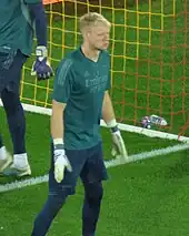 On 20 August 2021, Ramsdale signed for Premier League club Arsenal on a long-term contract.[36] He made his debut away to West Bromwich Albion in the 2021–22 EFL Cup five days later, and kept a clean sheet as Arsenal won 6–0.[37] He made his Premier League debut on 11 September and kept another clean sheet as Arsenal defeated Norwich City 1–0 at the Emirates Stadium.[38] After a run of clean sheets in the league, he conceded his first goal in a 3–1 home win against Tottenham Hotspur in the North London derby on 26 September.[39] In a 2–0 away win against Leicester City on 30 October,[40] he was highly praised for one of his saves and overall performance by pundits including former Manchester United goalkeeper Peter Schmeichel, who described his save from a James Maddison free kick as the "best save I've seen for years".[41][42] In November 2021, following a string of impressive performances, Ramsdale was one of eight players to be nominated for the Premier League's Player of the Month Award for October, though it was eventually awarded to Liverpool's Mohamed Salah.[43][44] He was also named Arsenal's Player of the Month for October 2021, with 60% of the votes from the club's supporters.[45] He won the award again in November with 42% of the votes.[46] Following the departure of Bernd Leno at the beginning of the 2022–23 season, Ramsdale took the number one shirt at Arsenal.[47]