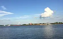 Tugboat navigating unused barges down the Mississippi River just north of the New Orleans Crescent City Connection.