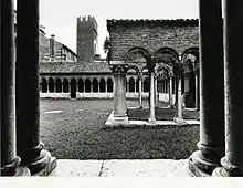 The earliest record of the cloister's presence dates it to the 10th century but its present arrangement is due to a renovation carried out between 1293 and 1313. The four sides are formed by small pointed arches on two sides and round arches on two others, supported by paired columns made of red Verona marble. On the northern side protrudes a quadrangular aedicule in which the ancient abbey well was located. On the perimeter walls of the ambulatories are placed sarcophagi and tombstones, among which the tomb of Giuseppe della Scala stands out, dating from 1313 and enriched by a lunette with a fresco by a painter of the Giotto school.[76]