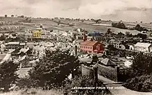 Postcard view of Lesmahagow c1935. Looking over the village, with buildings highlighted: Orange - Cordiner Church, Red - Old Parish Church, Blue - Free Church School on Peasehill, Green - Jubilee Hall (The Old North Church).