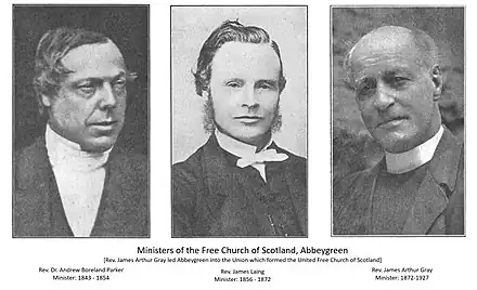 Dr. Parker continued as minister of Abbeygreen until 1854 when he was called to the Free Church congregation of Wellpark in Dennistoun, Glasgow.[114] On 16 May 1856 a probationer minister, the Rev. James Laing,[115] was ordained and inducted. Mr Laing continued as the minister in Abbeygreen until 25 February 1872 when he preached his farewell sermon on his translation to Glasgow-West Free Church,[116] thereafter to Bermondsey London and on 26 September 1878, to Stonehouse,[117] Lanarkshire. Rev. Laing's successor, the Rev. James Arthur Gray,[118] b.1843 at Slamannan, was ordained and inducted on 22 November 1872.