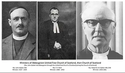 From the union with the Cordiner Church congregation, the Rev. T.F. Neill served the church until 1953 when he was called to Cranhill in Glasgow. On 6 April 1954, the Rev. Dr. Robert B.W. Walker MB, ChB was inducted as minister of Abbeygreen. Dr. Walker continued in the ministry until ill health forced him to demit his charge at the end of October 1981. Following a period of vacancy, a probationer minister, the Rev. David S. Carmichael, was ordained and inducted on 2 September 1982, where he served the Lord and his people until his retirement on 29 January 2023.