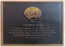 Plaque on the wall of 1 Tanfield, Canonmills, Edinburgh: Memorial to the first General Assembly of the Free Church of Scotland and to the 1847 unification of the United Secession and Relief Churches to form the United Presbyterian Church.