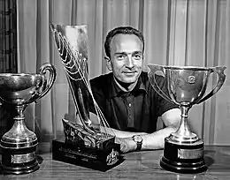 Abdon Pamich posing among some of his trophies. Genoa, May 1964.
