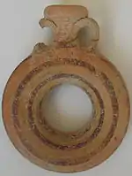 In 2018, archaeologists led by Robert Mullins from the Azusa Pacific University announced the discovery of a 2,800-year-old carved head sculpture of a man. The well-crafted figurine was described with long, black hair, a beard and a painted headband. He also had almond-shaped eyes and a serious expression on his face. According to archeologists, the measurements of carved in a glazed ceramic called faience were approximately 2.2 × 2 inches, and the head was once part of a small figurine, now lost that was 8 to 10 inches. The sculpture is on display at the Israel Museum in Jerusalem.[12][13][14]