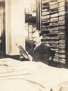 Dr. A. J. Grout in an herbarium, ca. 1900