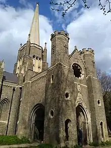 The concept of introducing classical elements into a gothic design had previously used in England only on rare occasions, such as for the Little Castle at Bolsover in Derbyshire, built after the Reformation, from 1612. It symbolised a connection with Romanesque-Gothic religious buildings of continental Europe, such as the monastic basilica of St. Procopius, Třebíč, Czech Republic, where Jewish and Christian cultures co-existed; now a UNESCO World Heritage Site.