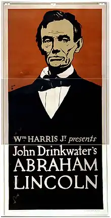 A rare depiction of events in the life of a U.S. President by a British playwright, Abraham Lincoln was a great success in its day. The play covers events in Lincoln's Presidency from his election in 1860 to his assassination, but omits most of the events in his private life. Abraham Lincoln was first produced in October 1918[1] at the Birmingham Repertory Theatre, of which John Drinkwater was the artistic director. Arnold Bennett and Nigel Playfair acquired the play and its company for the suburban Hammersmith Playhouse, where Abraham Lincoln became a sensational success with London audiences. Irish actor William J. Rea starred.[2]