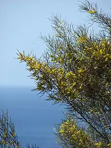 Like most Australian Acacia species, mulga is thornless.[2] The needle-like phyllodes stand erect to avoid as much of the midday sun as possible and capture the cooler morning and evening light. Any rain that falls is channelled down the phyllodes and branches to be collected in the soil immediately next to the trunk, providing the tree with a more than threefold increase in effective rainfall. Mulga roots penetrate far into the soil to find deep moisture. The roots also harbour bacteria that fix atmospheric nitrogen and thus help deal with the very old, nutrient-poor soils in which the species grows.