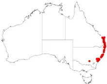 It is found in coastal regions in central and northern New South Wales extending north from the Illawarra region and into south eastern Queensland. It is usually situated on plateaus made of sandstone in rocky, exposed or damp areas as a part of coastal heathland communities.[1] It is found as far south as the Blue Mountains close to Sydney.[2]