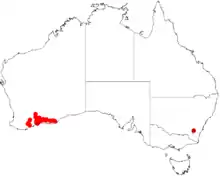 It has a discontinuous distribution and is native to an area in the Wheatbelt, Goldfields-Esperance and Great Southern regions of Western Australia where it is found in low-lying areas an undulating plains growing in rocky clay-loam soils.[1] It is found from around Ongerup in the west to around Mount Beaumont which is around 90 km (56 mi) north of Esperance.[2]
