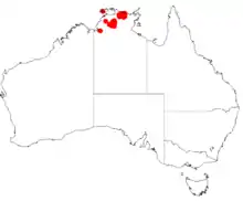It is endemic to the northern parts of the Northern Territory including Bathurst Island and from around Maningrida in the north to Umbrawarra Gorge near Pine Creek in the south.[1] It is often situated around or close to streams in sandstone plateaux and gorges country and on coastal flats where it grows in sandy soils.[2]